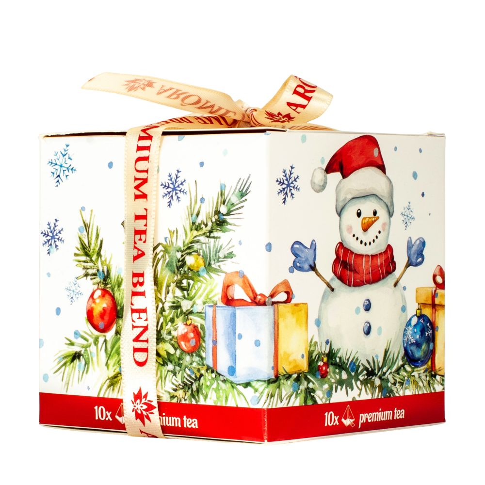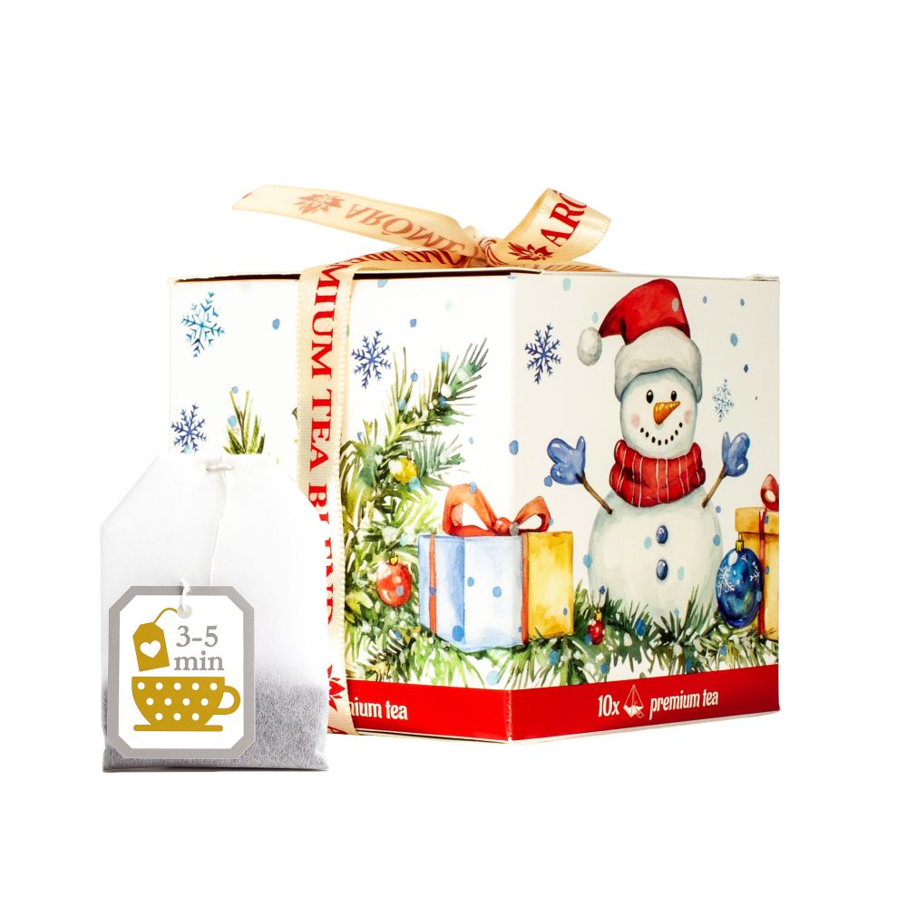 Lahodný černý čaj ze Srí Lanky se dvěma různými příchutěmi. Čajové sáčky, 5 kusů od každé příchuti, jsou zabaleny v papírové krabičce s vánočním motivem a mašličkou.