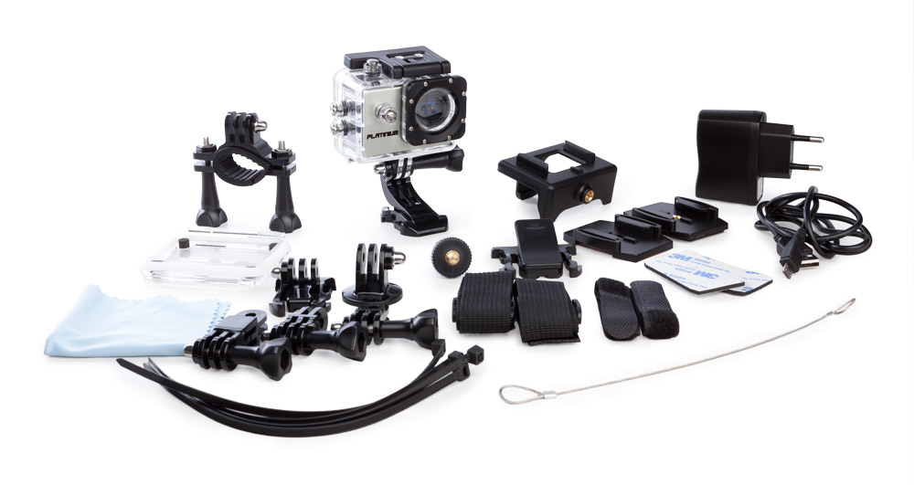 držák kamery 3 ks, základna s fix. páskou 2 ks, držák základny s fix. páskou, držák pouzdra, základna, pouzdro, klip pouzdra, pásky pro upnutí, fix. 3m pásky 2 ks, lanko s oky, stahovací pásky 4 ks, úchyt na kolo, zadní kryt kamery, adaptér, USB kabel, hadřík na čištění