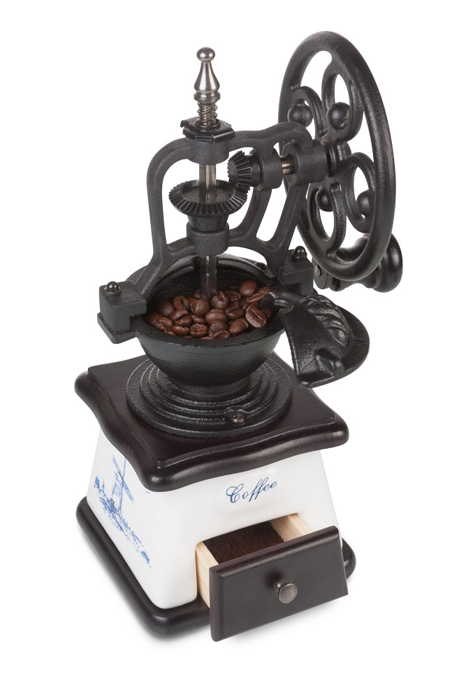 Ruční mlýnek na zrnkovou kávu v retro stylu s možným nastavením hrubosti mletí.