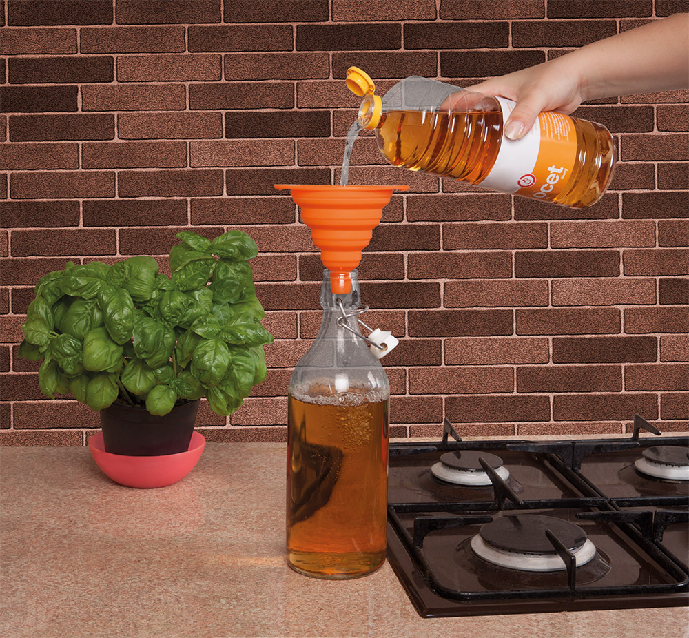 Skládací nálevka ze speciálního silikonového materiálu, jednoduše se rozloží a složí, nezabere v kuchyni mnoho místa. Skládací nálevka je vhodná na nejrůznější průměry nádob nebo sklenic k nalévání teplých i studených tekutin. Nálevka se snadno udržuje a je dokonale zdravotně nezávadná.