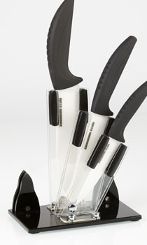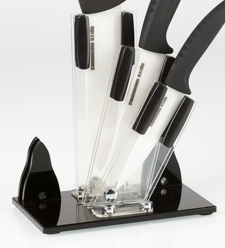 Stojánek na nože má 3 různě veliké přihrádky na nože, je ideální na keramické nože z naší nabídky - 1x univerzal + 1x chef + 1x gourmet.