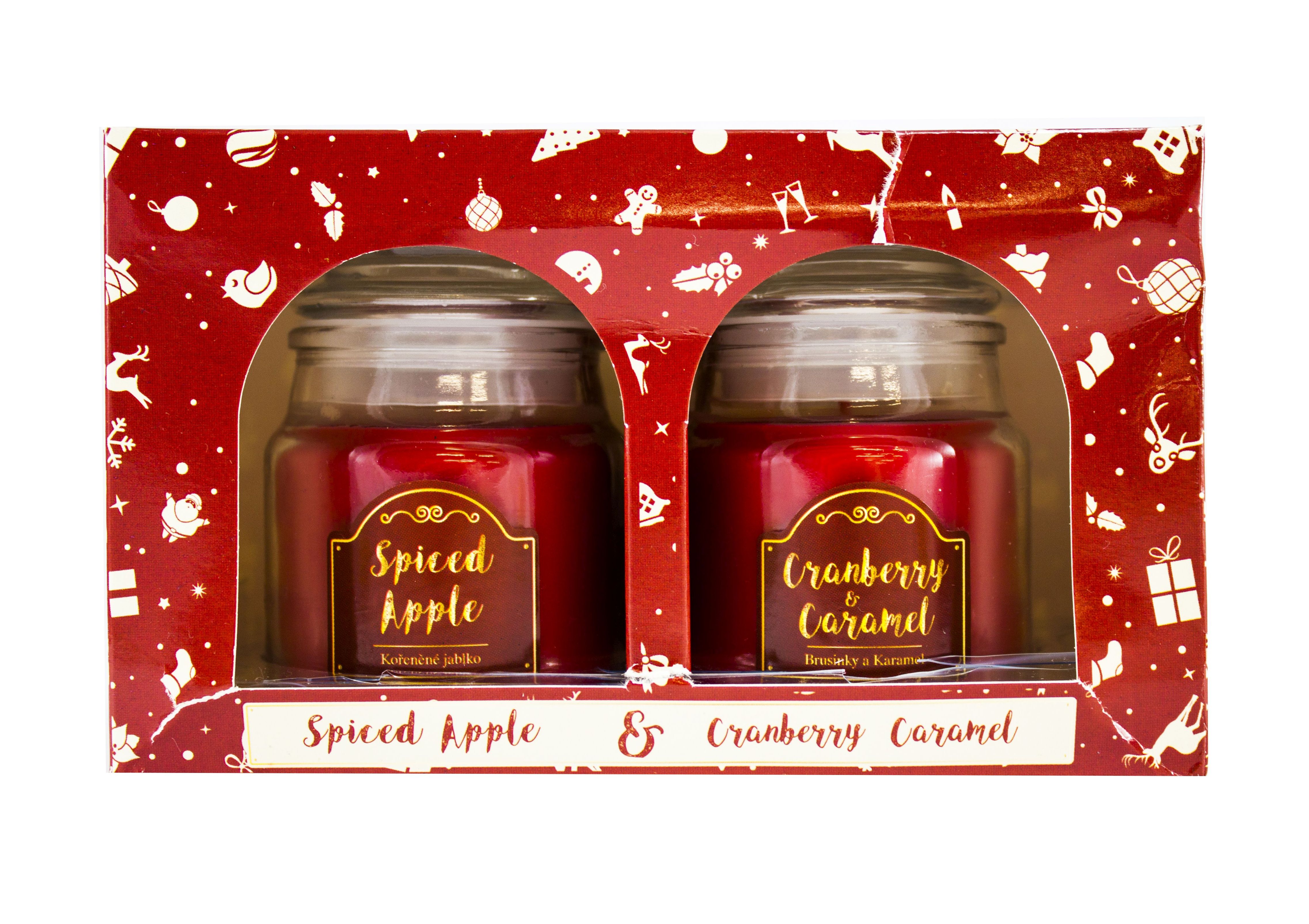 Vánoční skleněná svíčka s těsnícím víčkem - dodáváno v sadě 2 kusů - jedna svíčka s vůní Spiced Apple (kořeněné jablko) a druhá Cranberry & Caramel (brusinka & karamel).