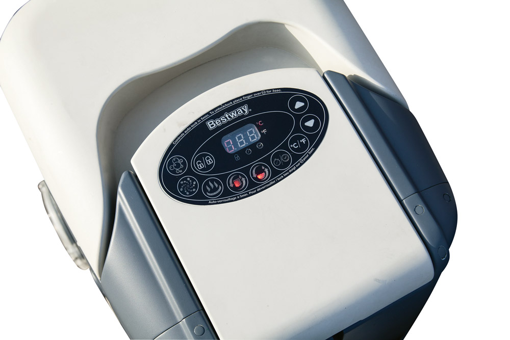 Hlavní ovládací jednotka zajišťuje všechny provozní funkce vířivého bazénu a to výkonnou kartušovou filtraci, průtokový digitálně nastavitelný ohřev až do 40°C, vzduchový kompresor pro nafouknutí a následné zásobování vzduchových a masážních trysek.